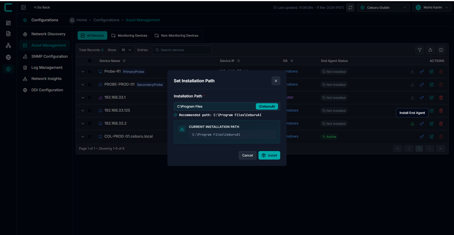 Once devices are added under Assets and credentials are configured, you can install the Ceburu End Agent to enable endpoint log collection and monitoring.