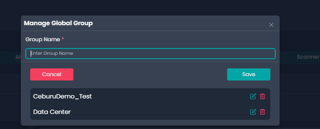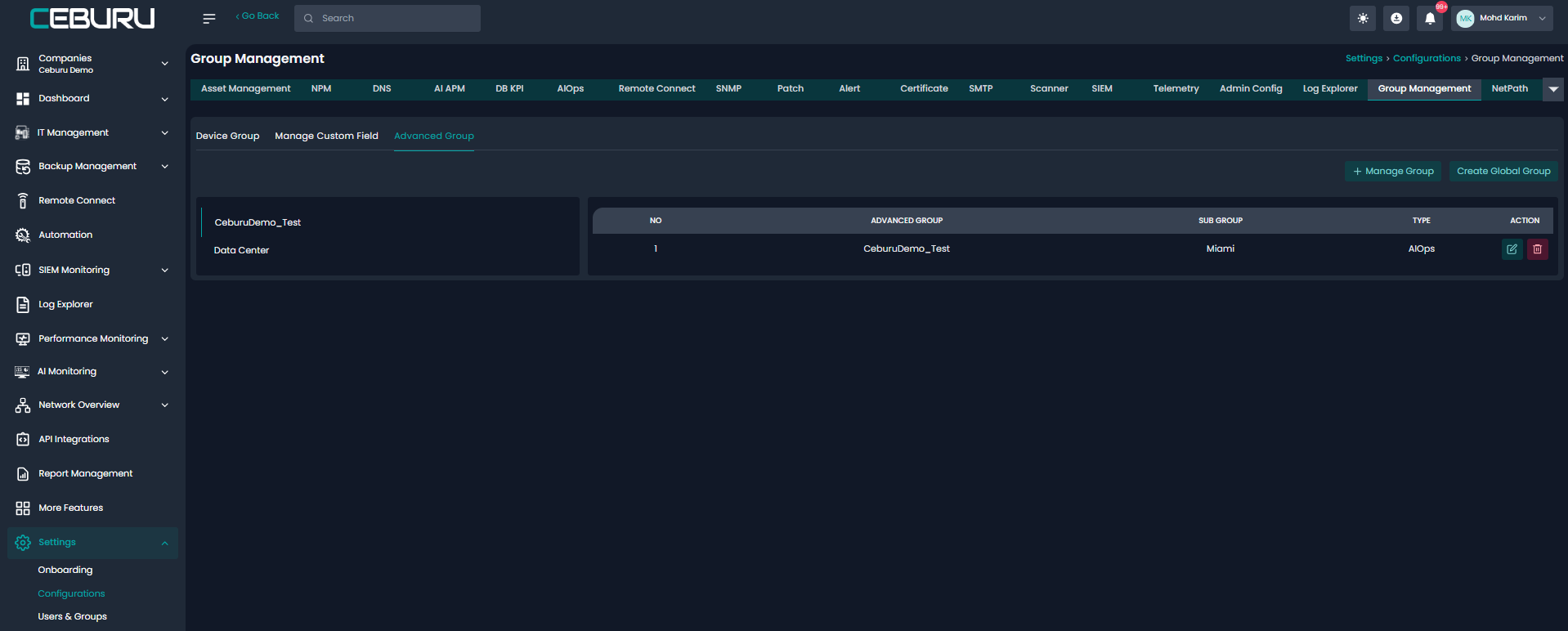 The configuration begins in the Group Management section under Settings. Create a Global Group, which acts as the top-level container. The Global Group name typically represents a customer, organization, or major environment. Once saved, this Global Group becomes available throughout the platform as a selectable scope for monitoring and reporting.