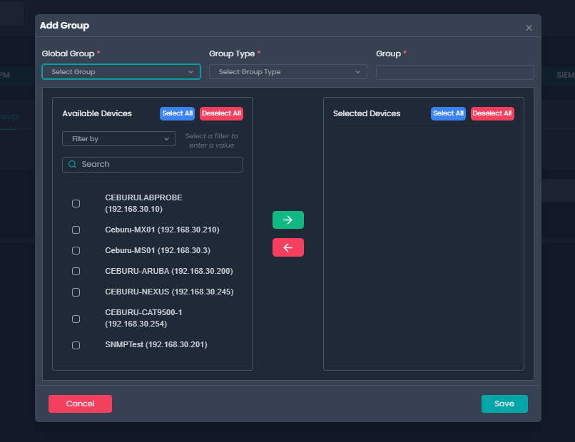 After creating the Global Group, sub-groups are configured under it using the Advanced Group option. A sub-group represents a logical subdivision of the Global Group, such as a specific data center, city, or operational site. Selects the Global Group, specifies the group type, and assigns a meaningful name to the sub-group. Devices are then added to this sub-group by selecting them from the available device list and moving them into the selected devices panel. This step associates each device with a specific location or environment.