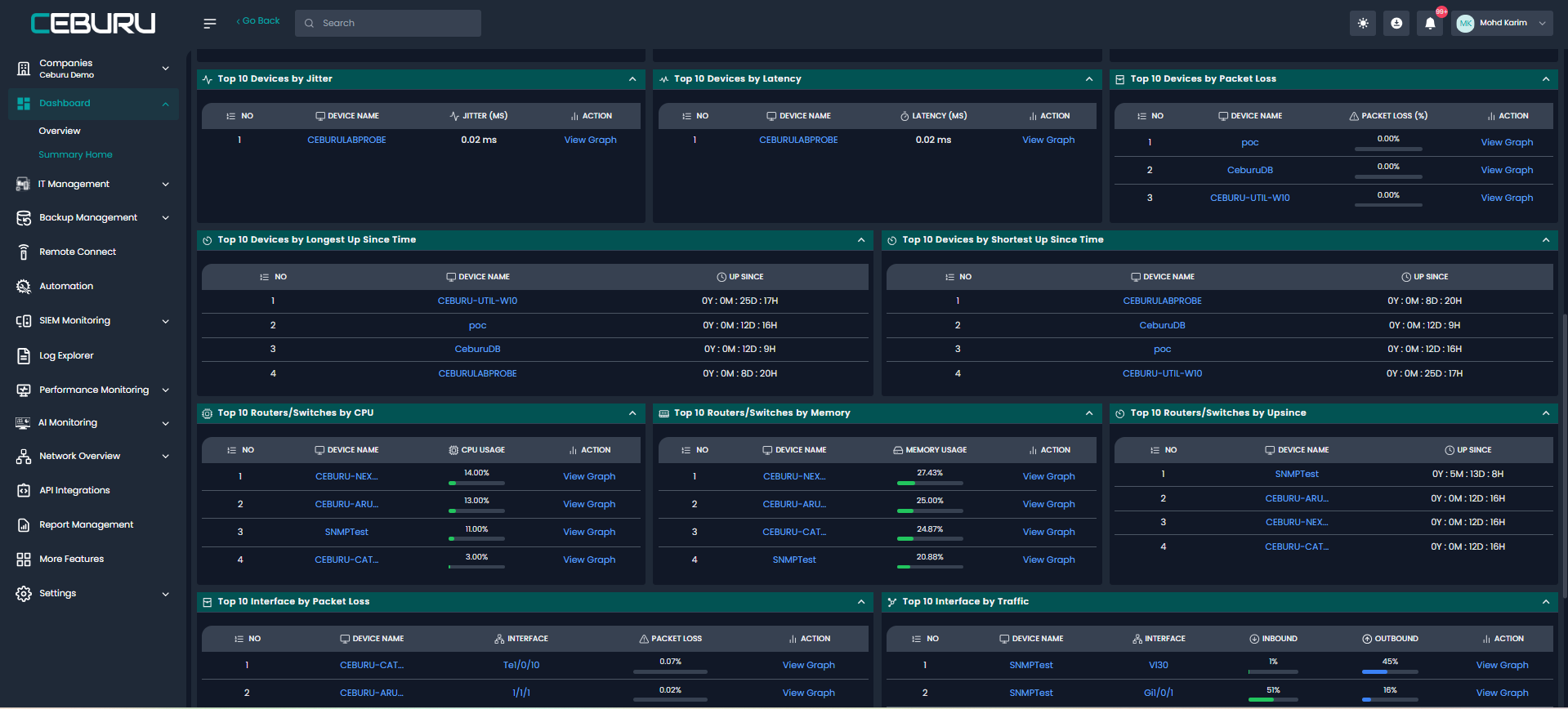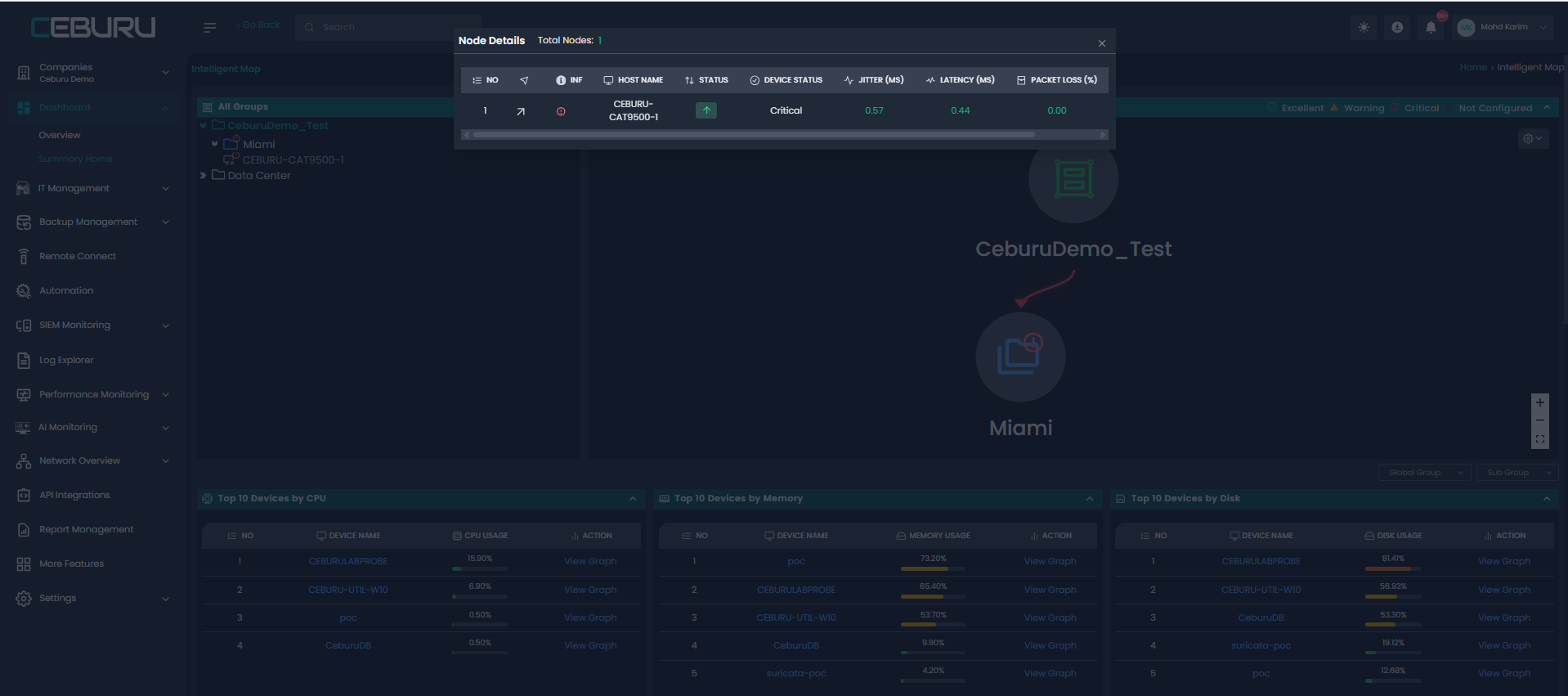 The Top-10 widgets on Summary Home also dynamically update based on the selected group. Metrics such as CPU usage, memory utilization, disk usage, latency, jitter, packet loss, and uptime are calculated only from the devices within the group. This allows teams to identify the most resource-intensive or unstable devices within a specific environment instead of across the entire infrastructure.