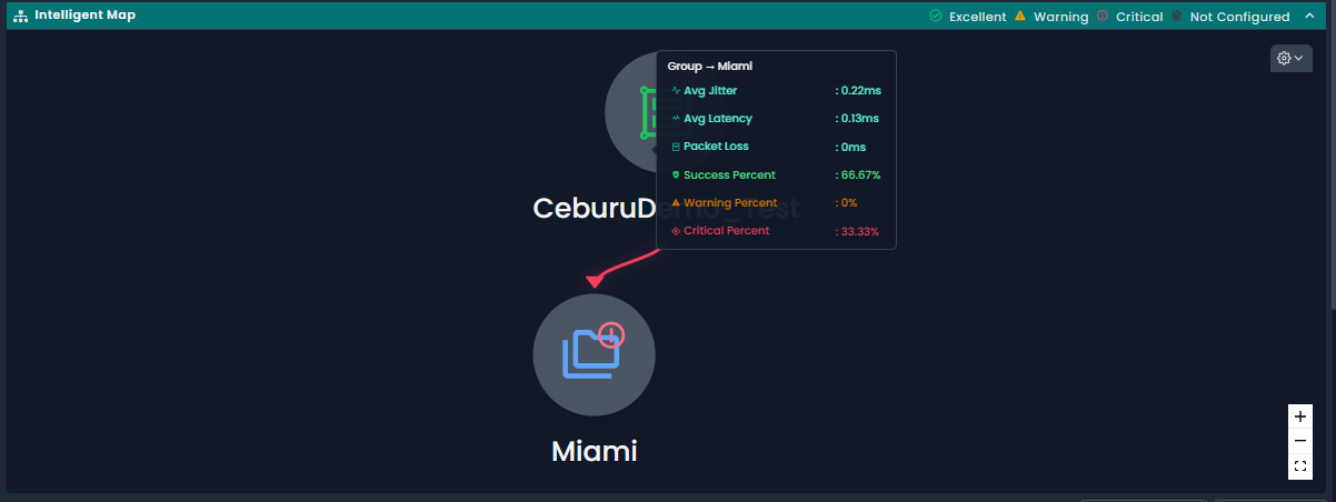 The Intelligent Map also reflects the health status of each group and device. Any warnings or critical states within a sub-group become visible immediately, to validate both the configuration and the operational state of the environment.