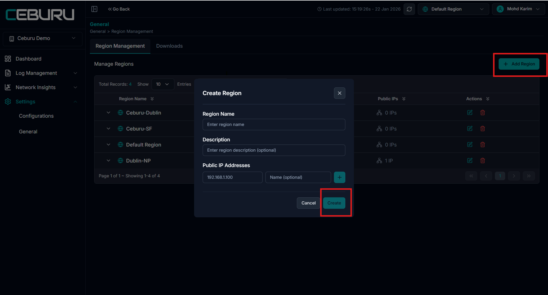 - Edit region details such as name, description, or IP addresses