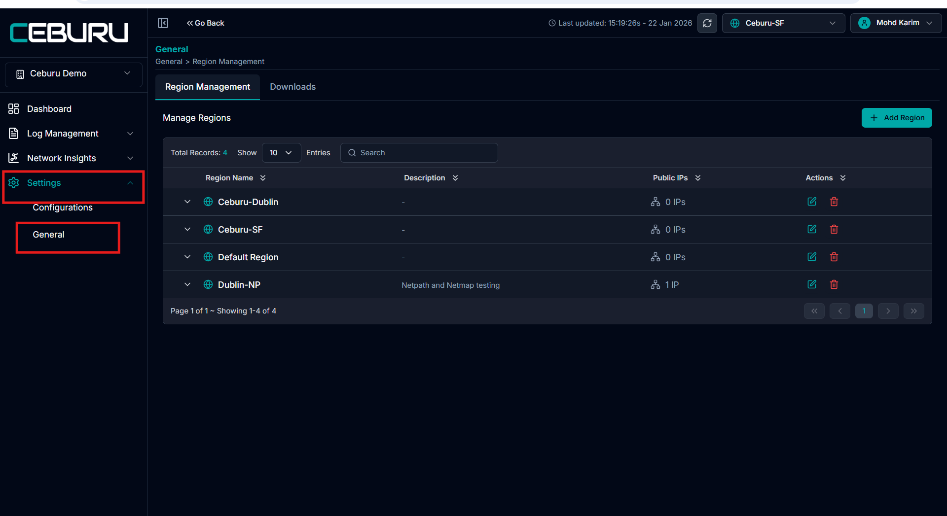 - The region appears immediately in the Region Management dashboard. It becomes available for assigning probes and agents. Public IPs are linked to the region for monitoring and insights