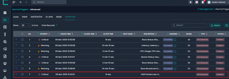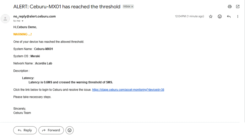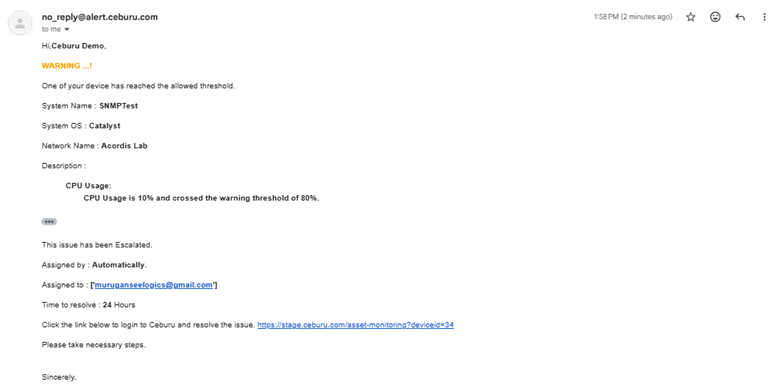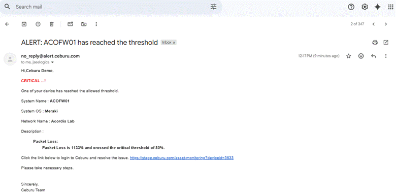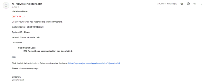 This alert triggers when a device experiences 15% packet loss continuously for 30 minutes. The sustained duration ensures that only persistent network issues generate alerts and it is classified as a Priority 3 incident.