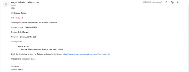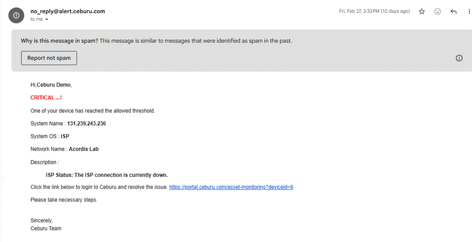 This alert occurs when a standard or non critical node becomes unavailable. Although not classified as critical infrastructure, monitoring ensures visibility of device availability and network health.