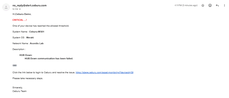 This alert is generated when a Meraki hub device becomes unreachable or stops responding. Because hubs are central points in SD-WAN architecture, this may affect multiple branch locations.