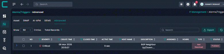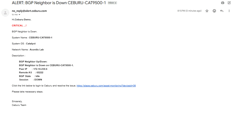 This alert detects when a BGP neighbor session if network goes down. Loss of a BGP session may cause routing instability and affect external network connectivity.