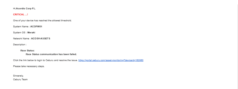 This alert is generated when a Meraki SD-WAN node remains down for more than 10 minutes. The delay ensures transient network interruptions do not trigger alerts while still detecting sustained outages.