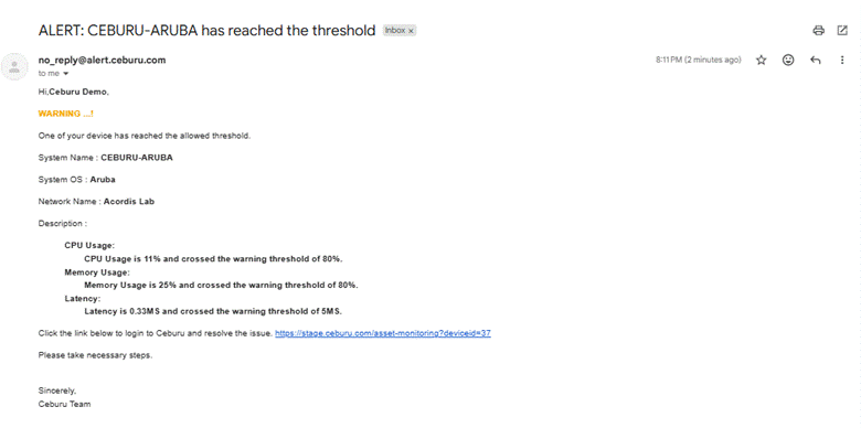 This alert triggers when bandwidth utilization reaches 80% of the available capacity. This indicates that the network link is approaching its maximum capacity and may soon experience congestion if traffic increases further.
