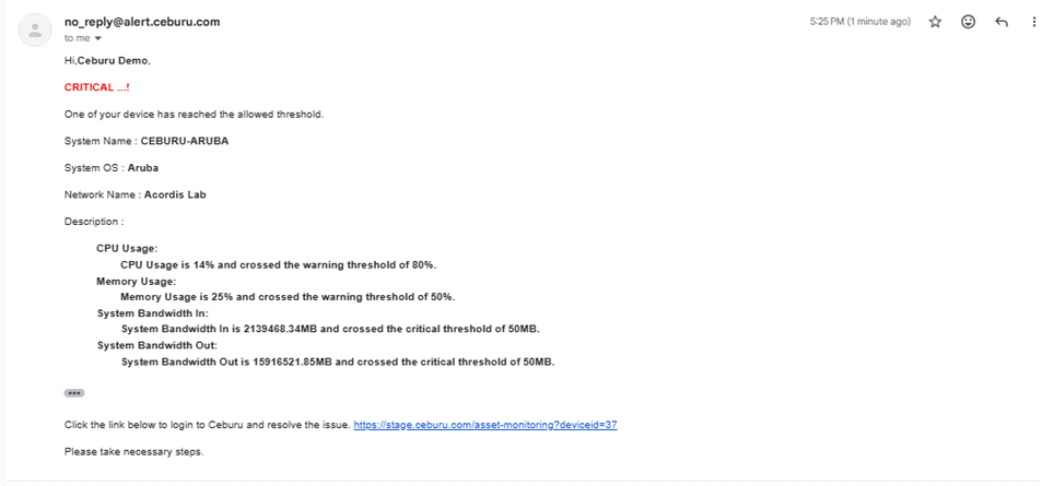This alert triggers when bandwidth utilization reaches 90%, indicating that the network link is close to full capacity. At this level, the link may start experiencing packet drops, latency, and reduced performance.