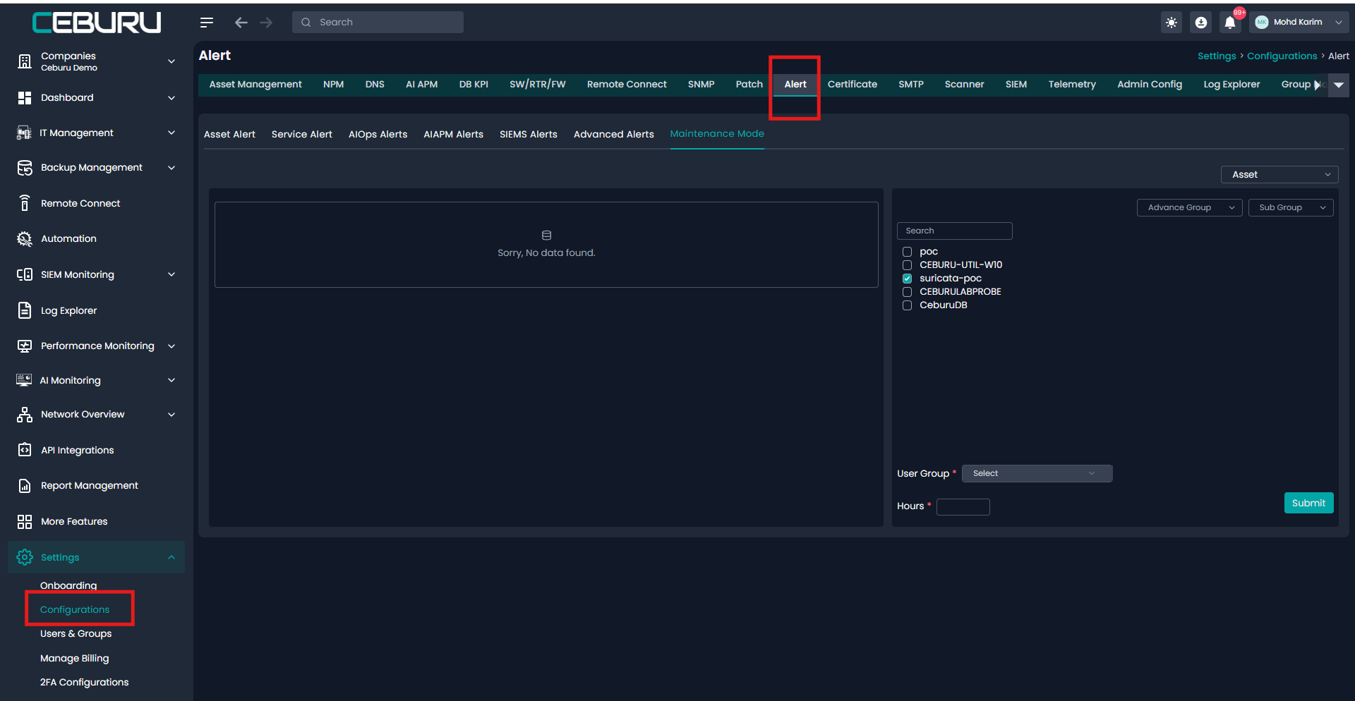 Maintenance Mode allows administrators to temporarily suppress alerts for selected assets during planned maintenance activities. This prevents unnecessary alert notifications while systems are intentionally offline or undergoing changes.