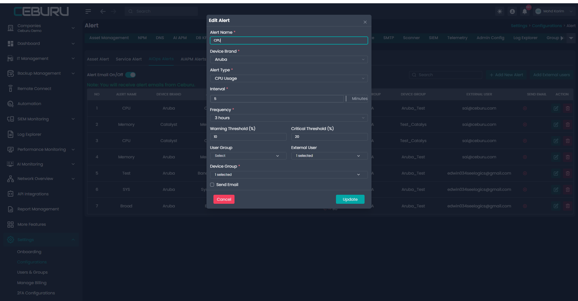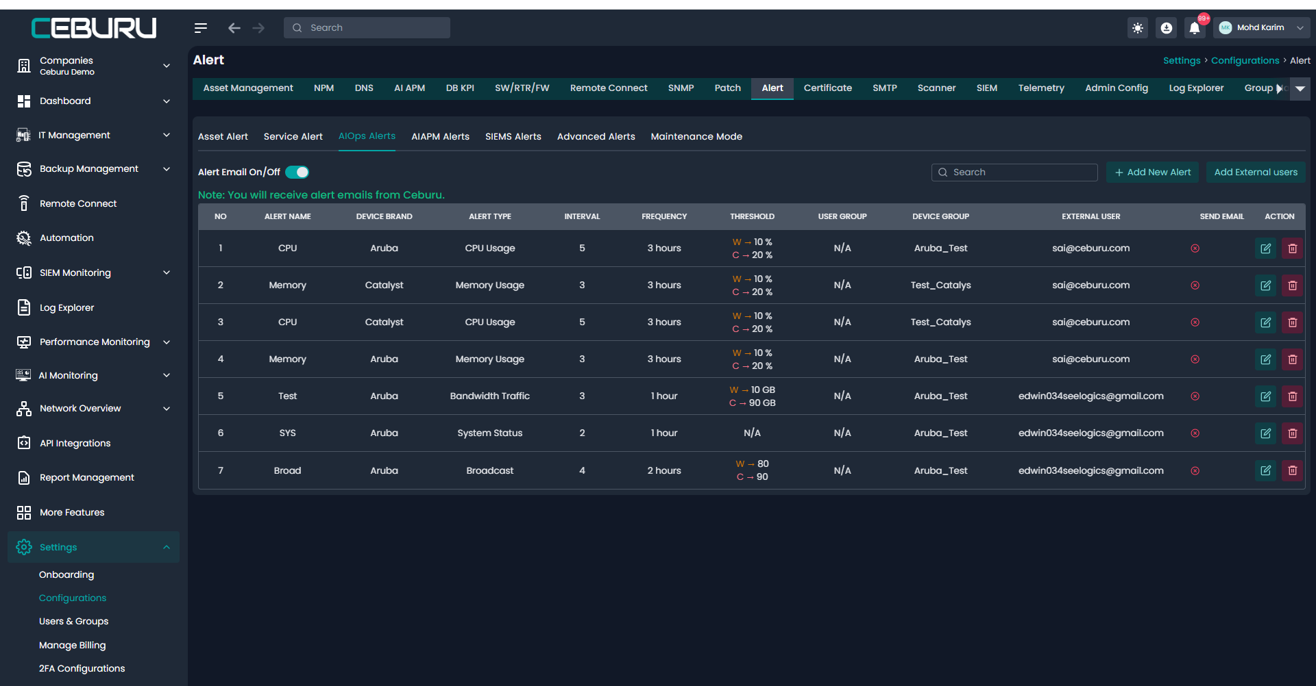 Navigate to Settings > Configurations > Alert > AIOps Alerts