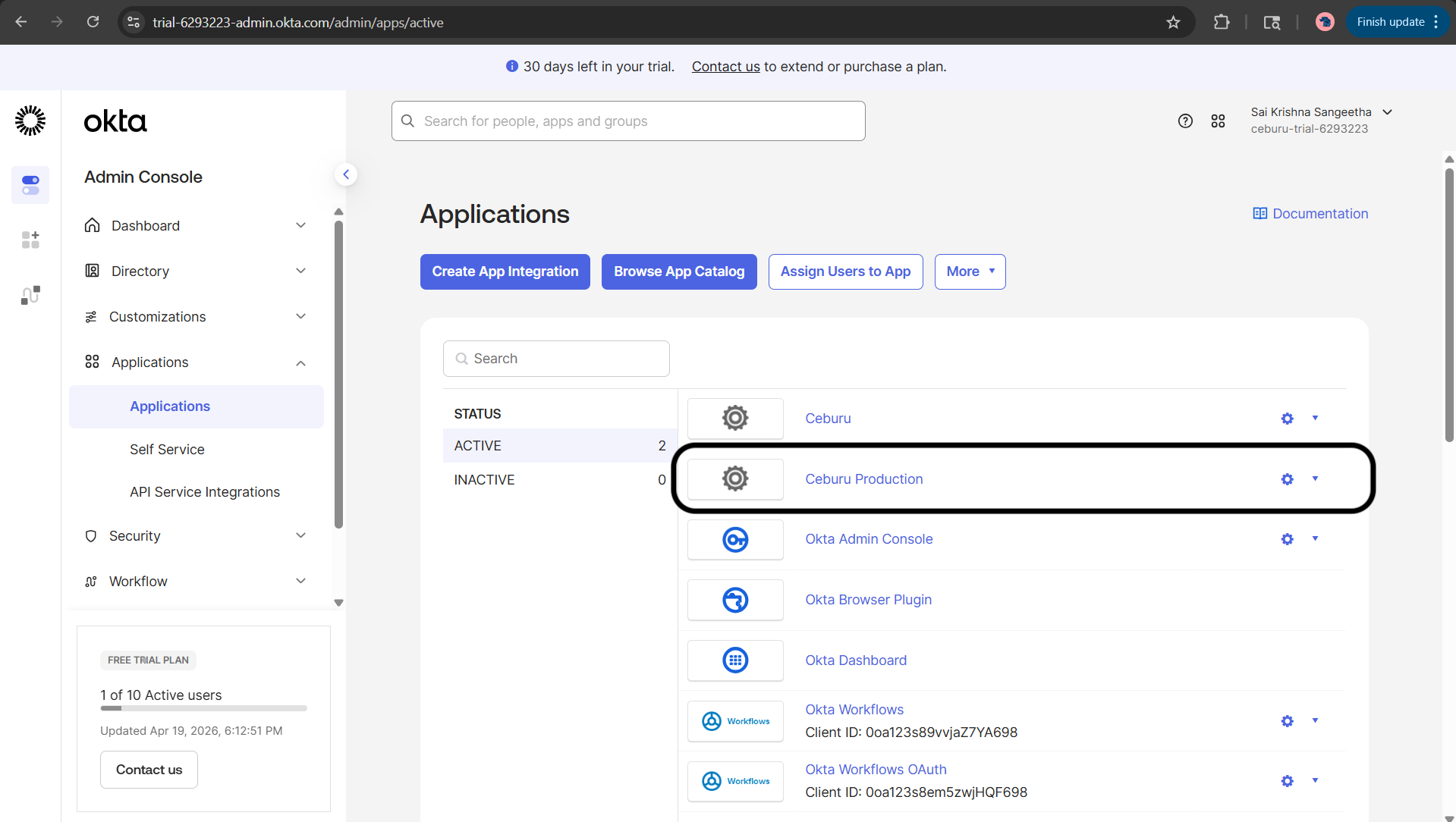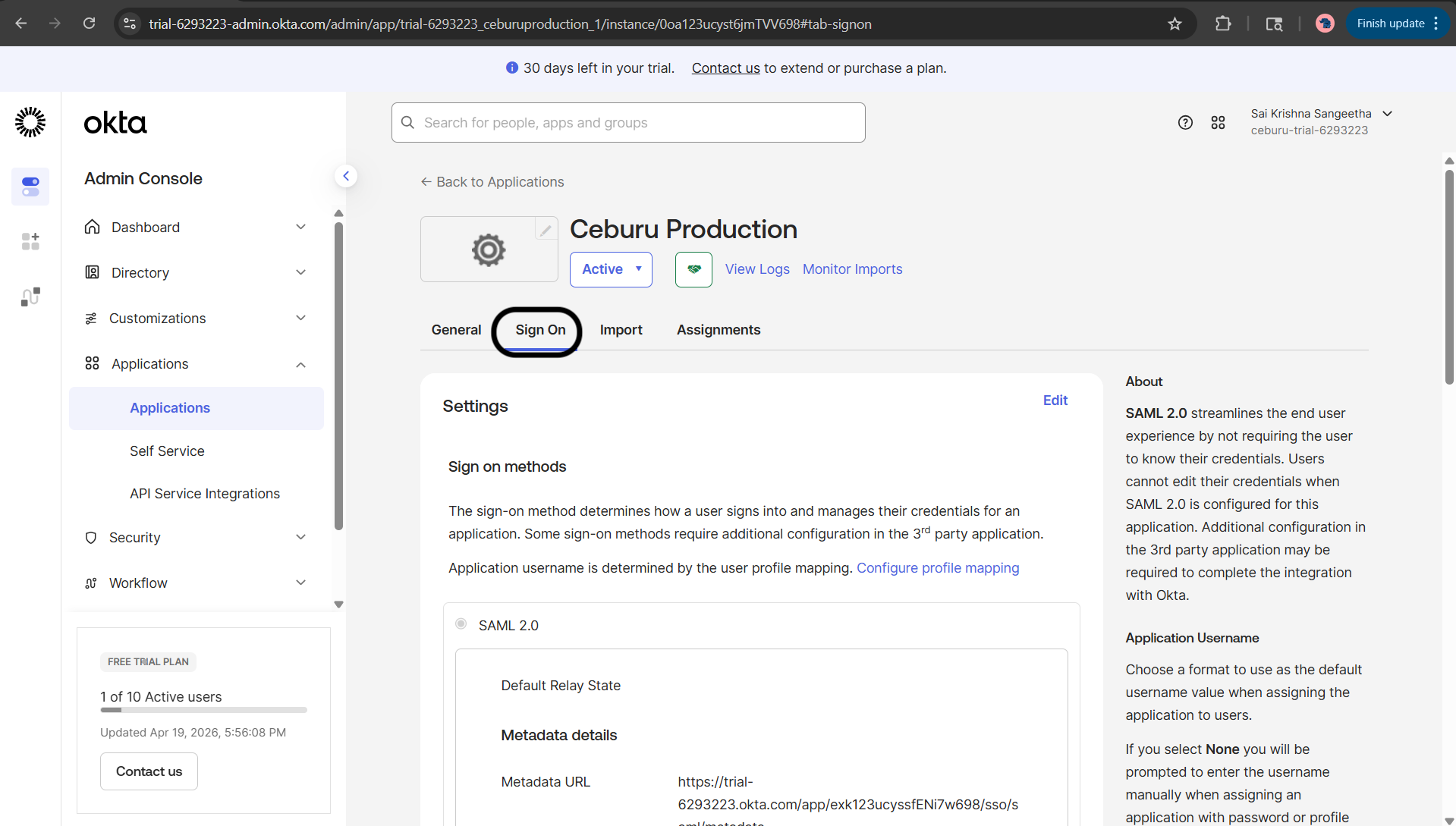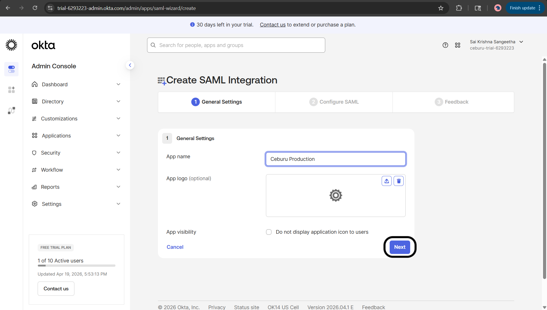 Create a custom SAML 2.0 application in Okta for Ceburu Production.