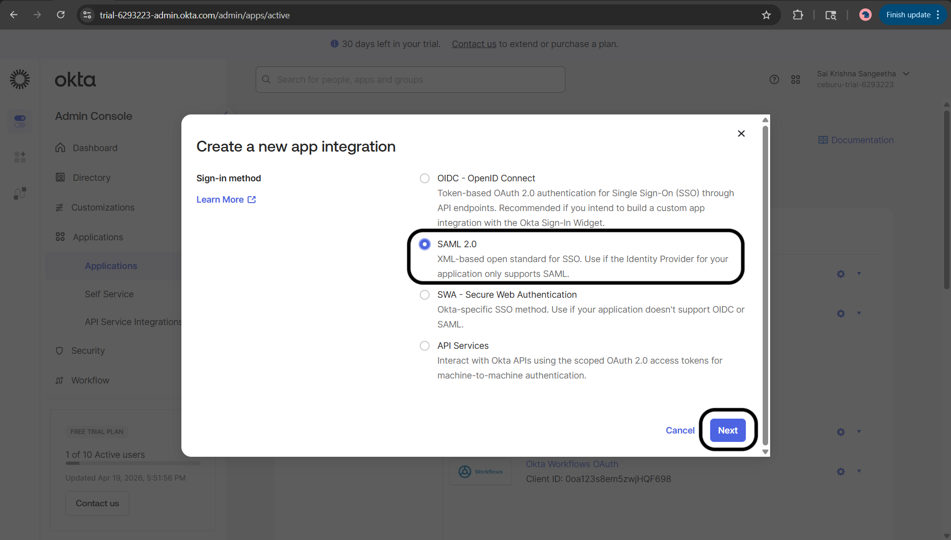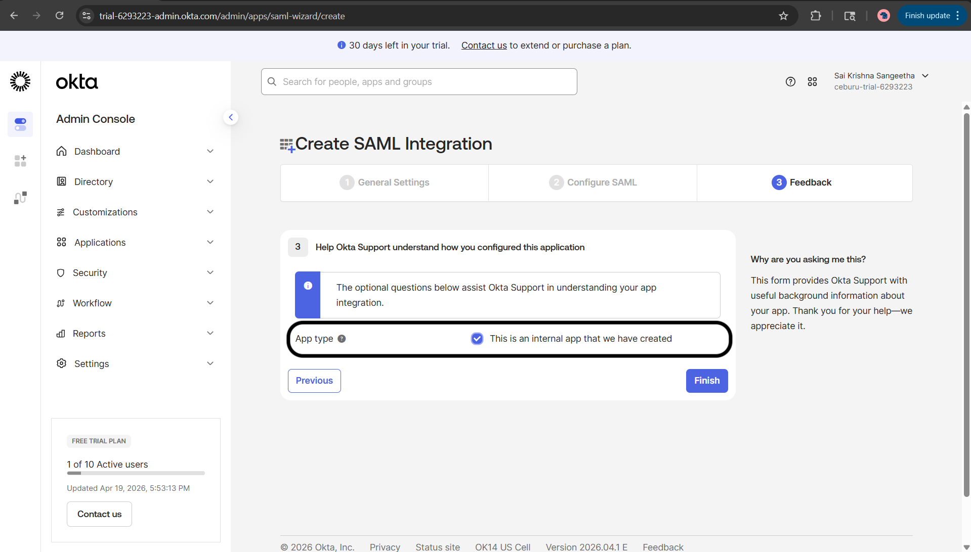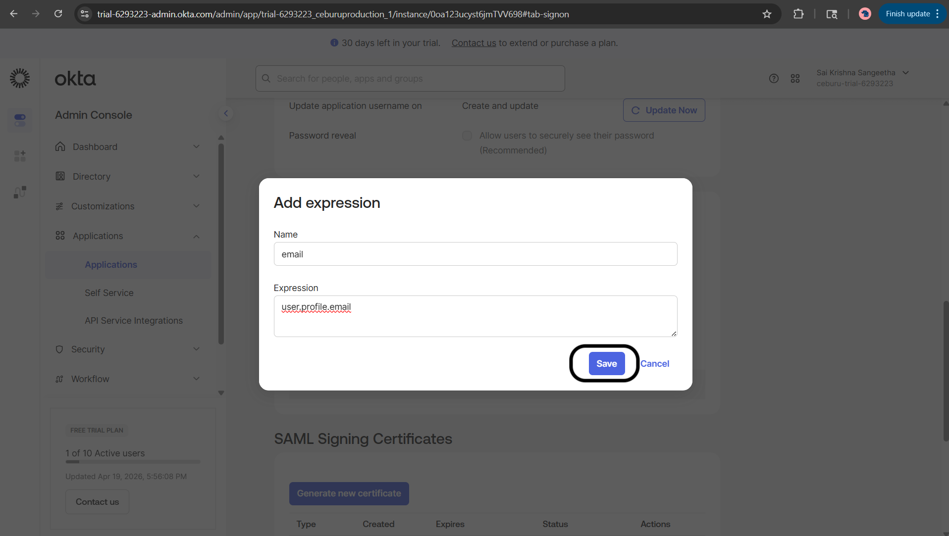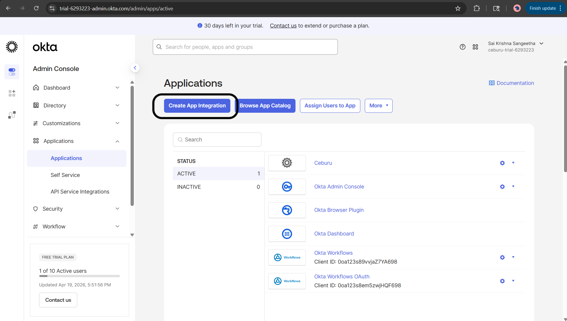 Create a custom SAML 2.0 application in Okta for Ceburu Production.