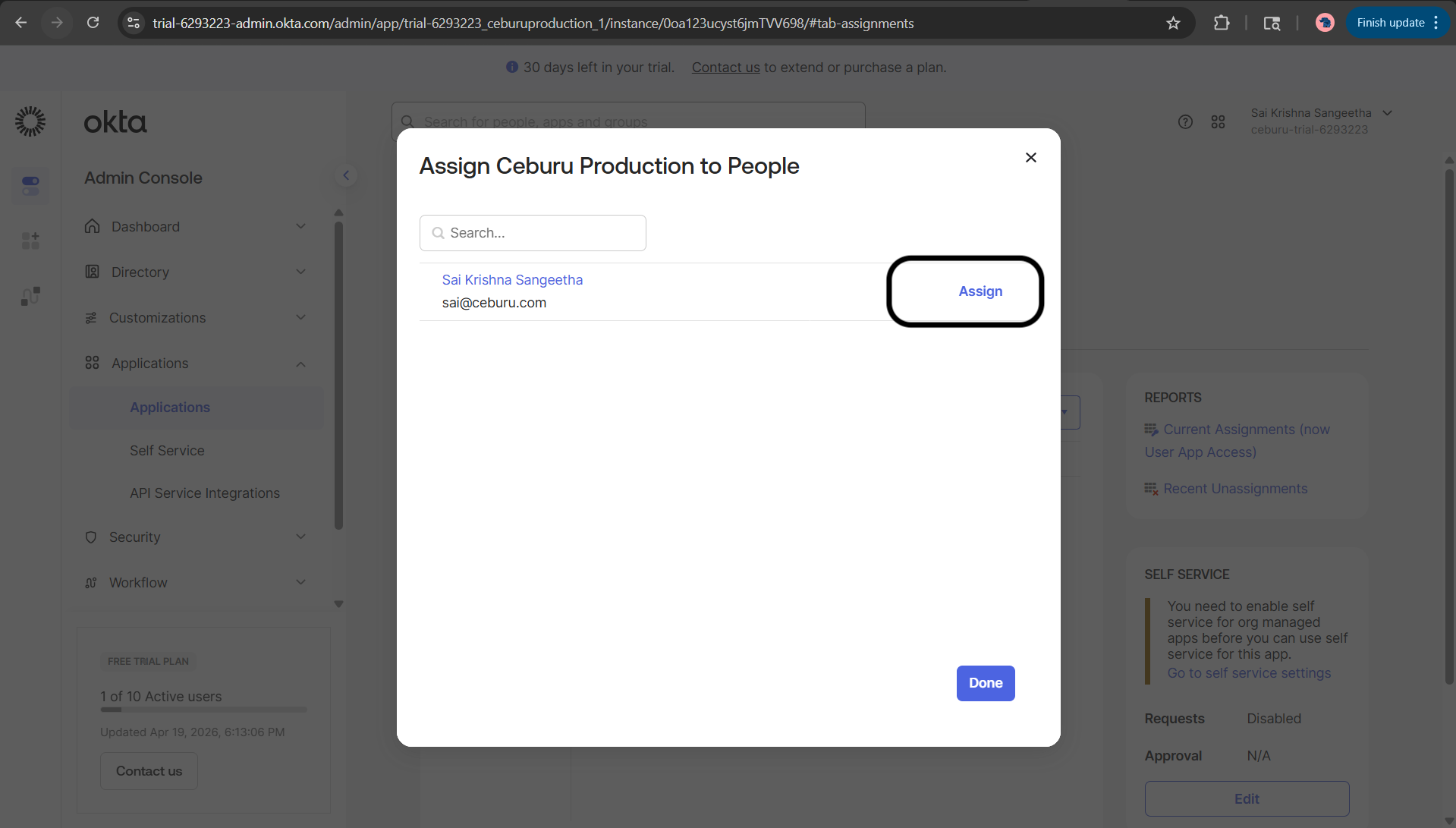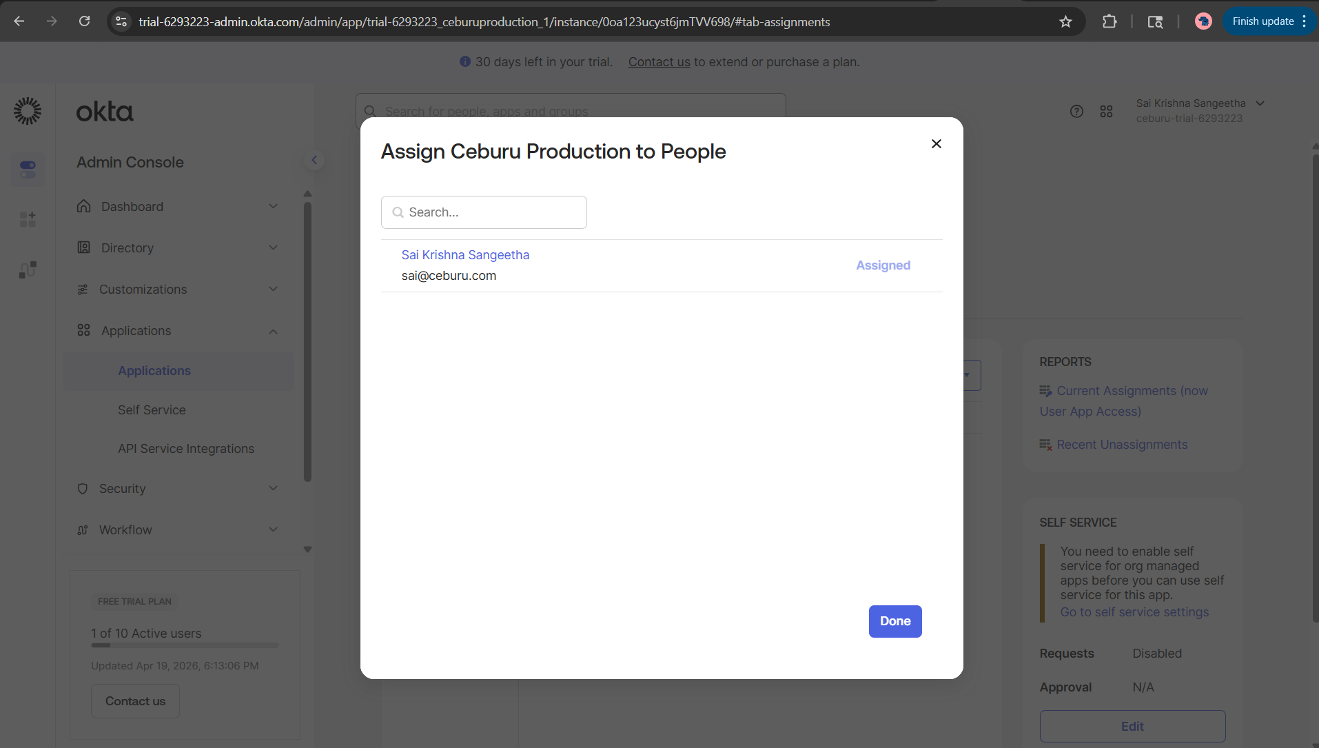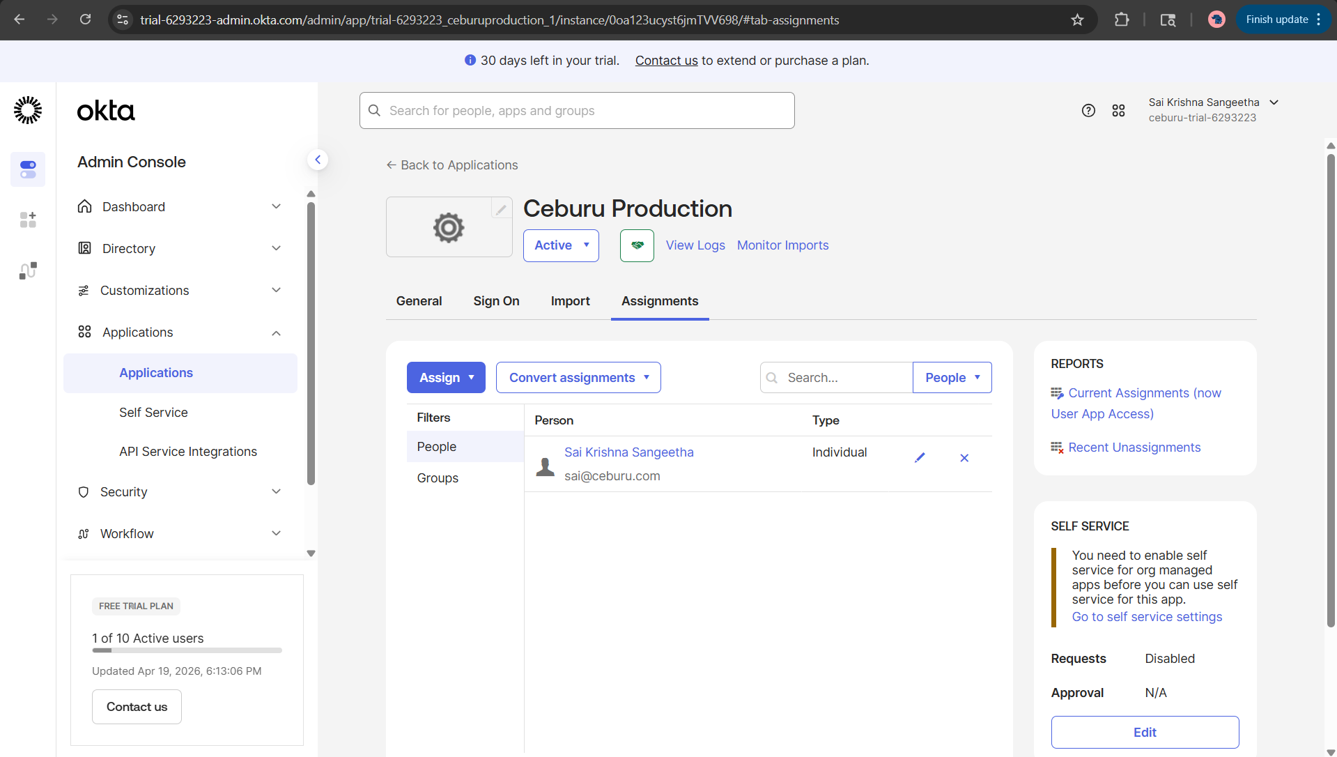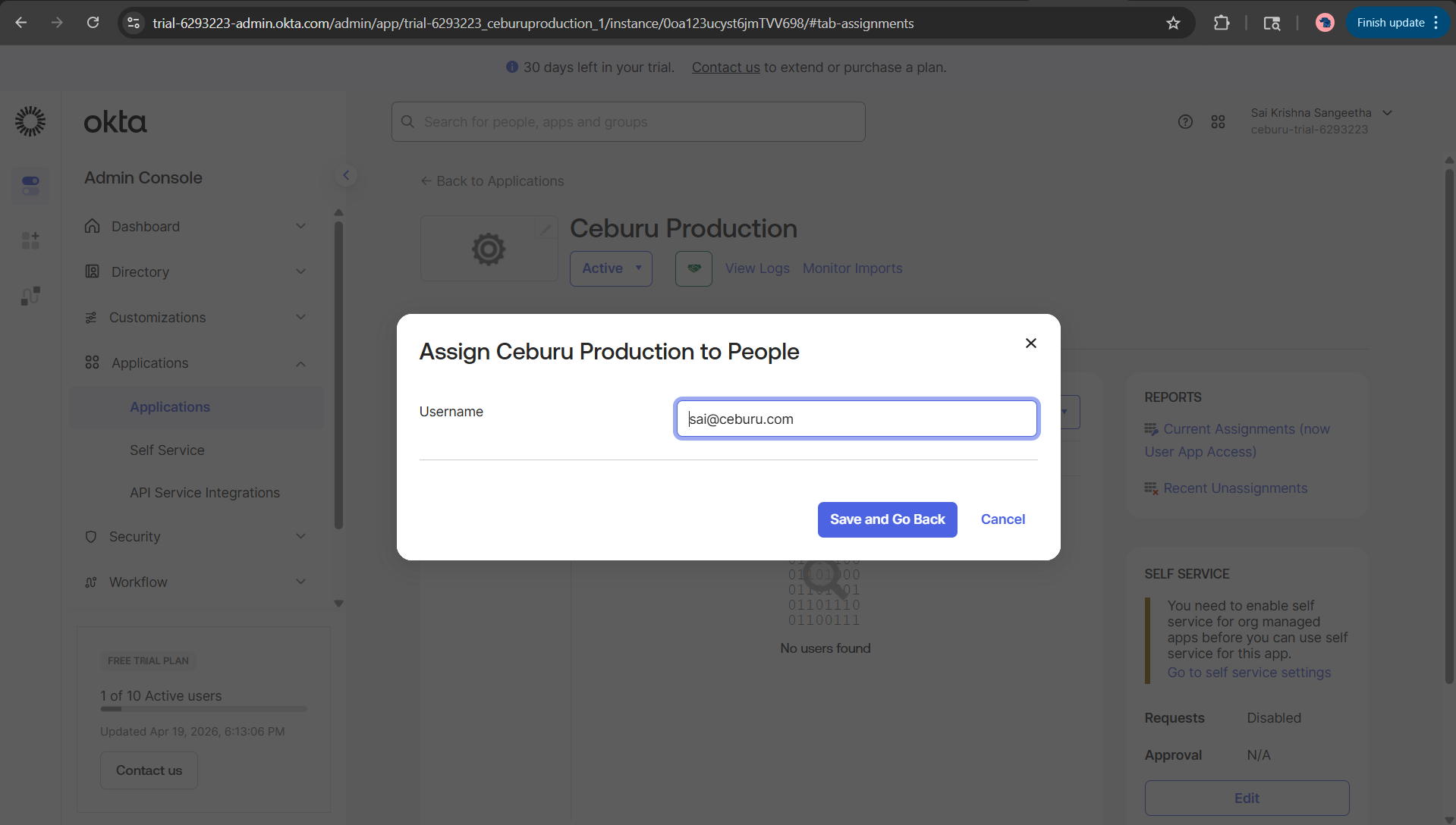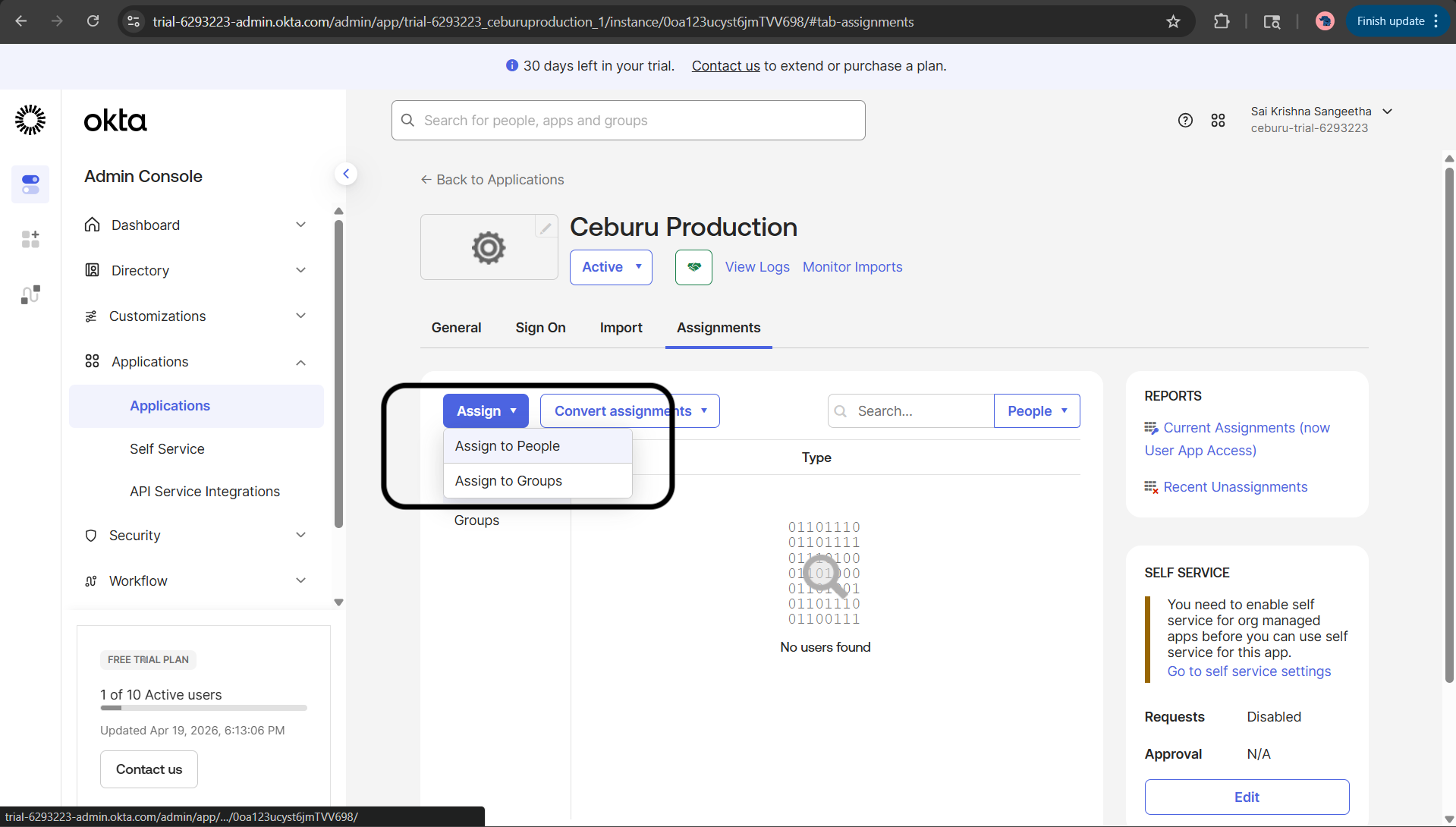 - each user who should sign in to Ceburu is assigned to the Okta app