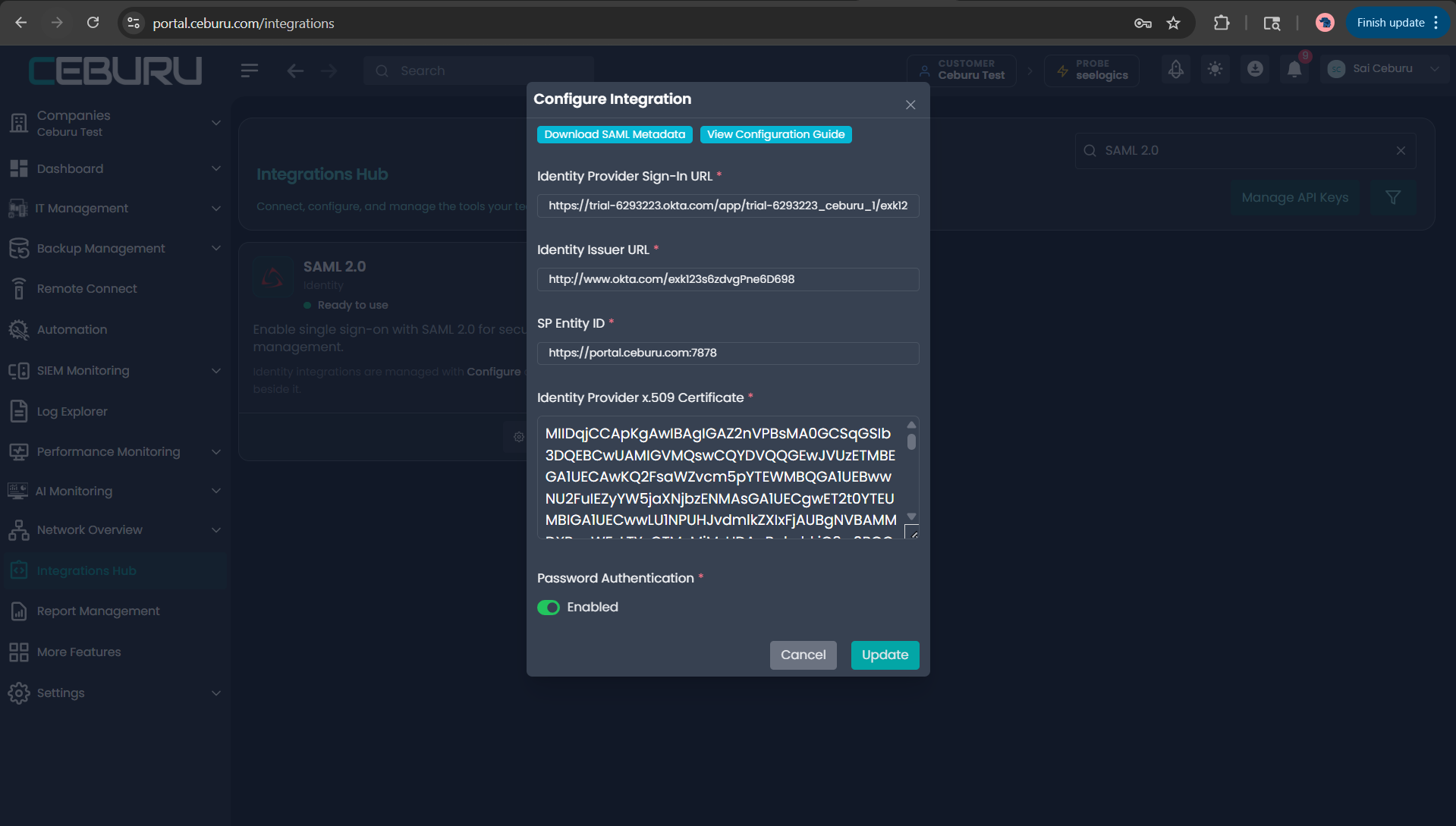 https://portal.ceburu.com:7878 - Identity Provider x.509 Certificate: paste the Okta Signing Certificate