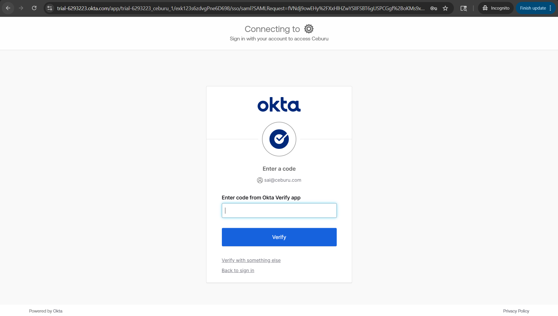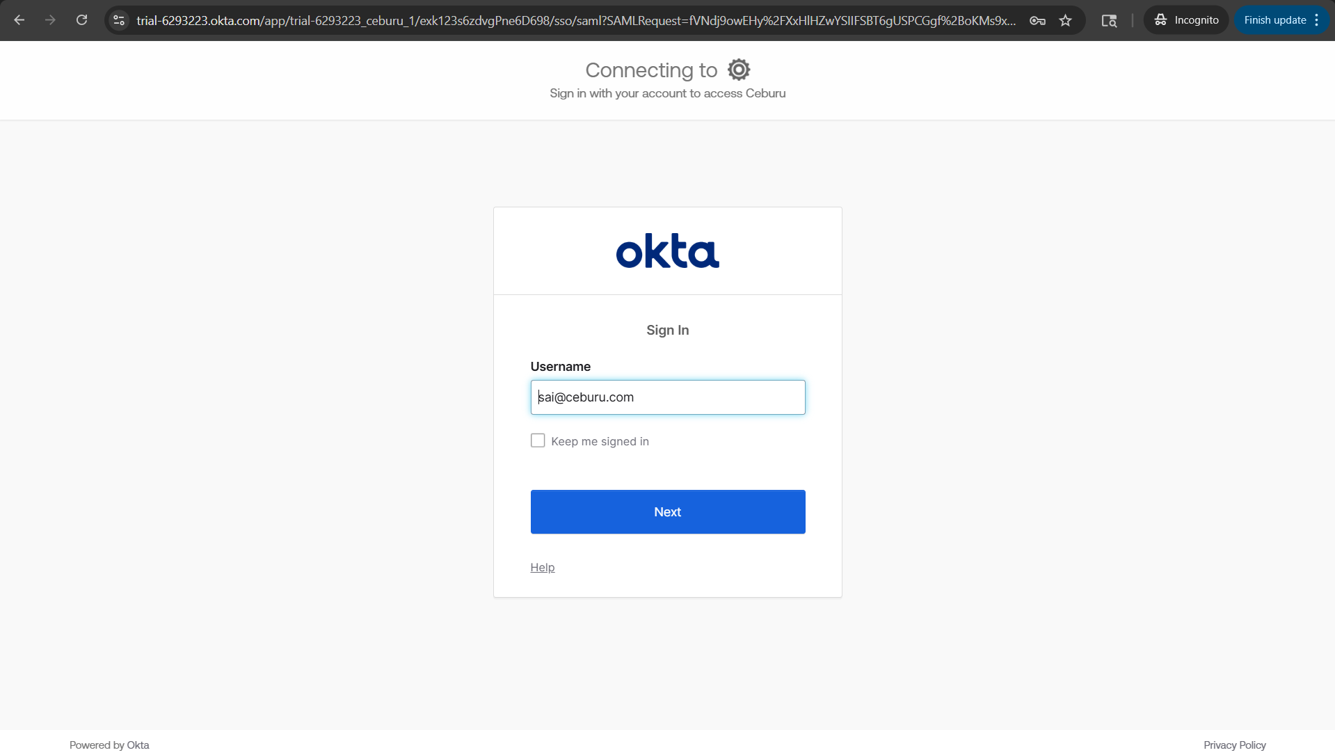 Once both Okta and Ceburu are configured, validate the experience from the production login page.